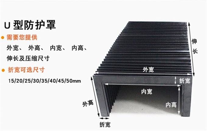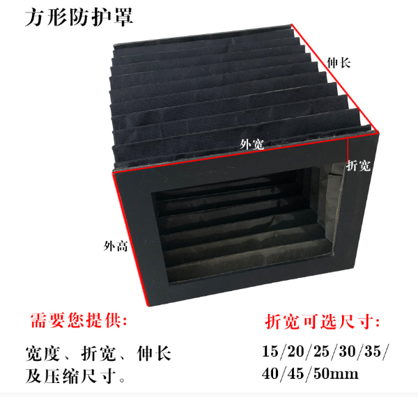 同樣其它樣式的防塵罩定制參數(shù),只要告知我們護(hù)罩截面及總長(zhǎng)和壓縮的尺寸,就可以為你定做!